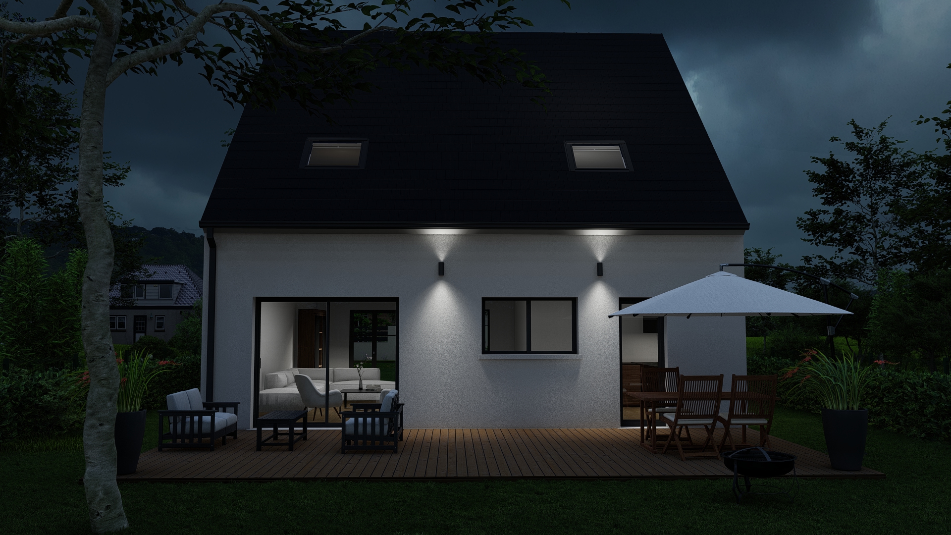 Les ouvertures généreuses, en façade arrière, permettent une belle diffusion de la lumière naturelle et prolongent les espaces de vie vers l’extérieur. L’intégration du garage dans le volume principal participe à l’unité architecturale et à la cohérence globale du projet.