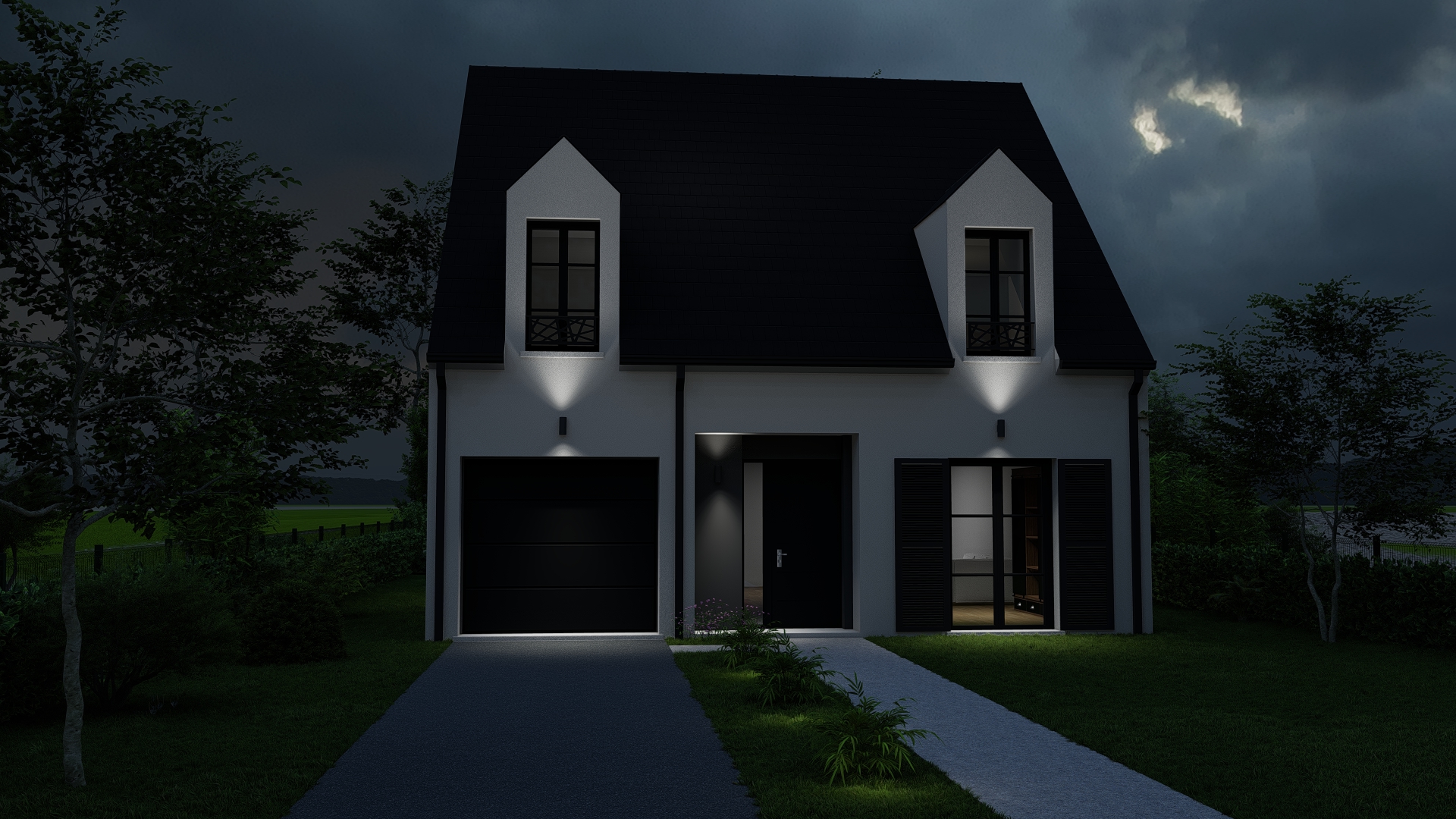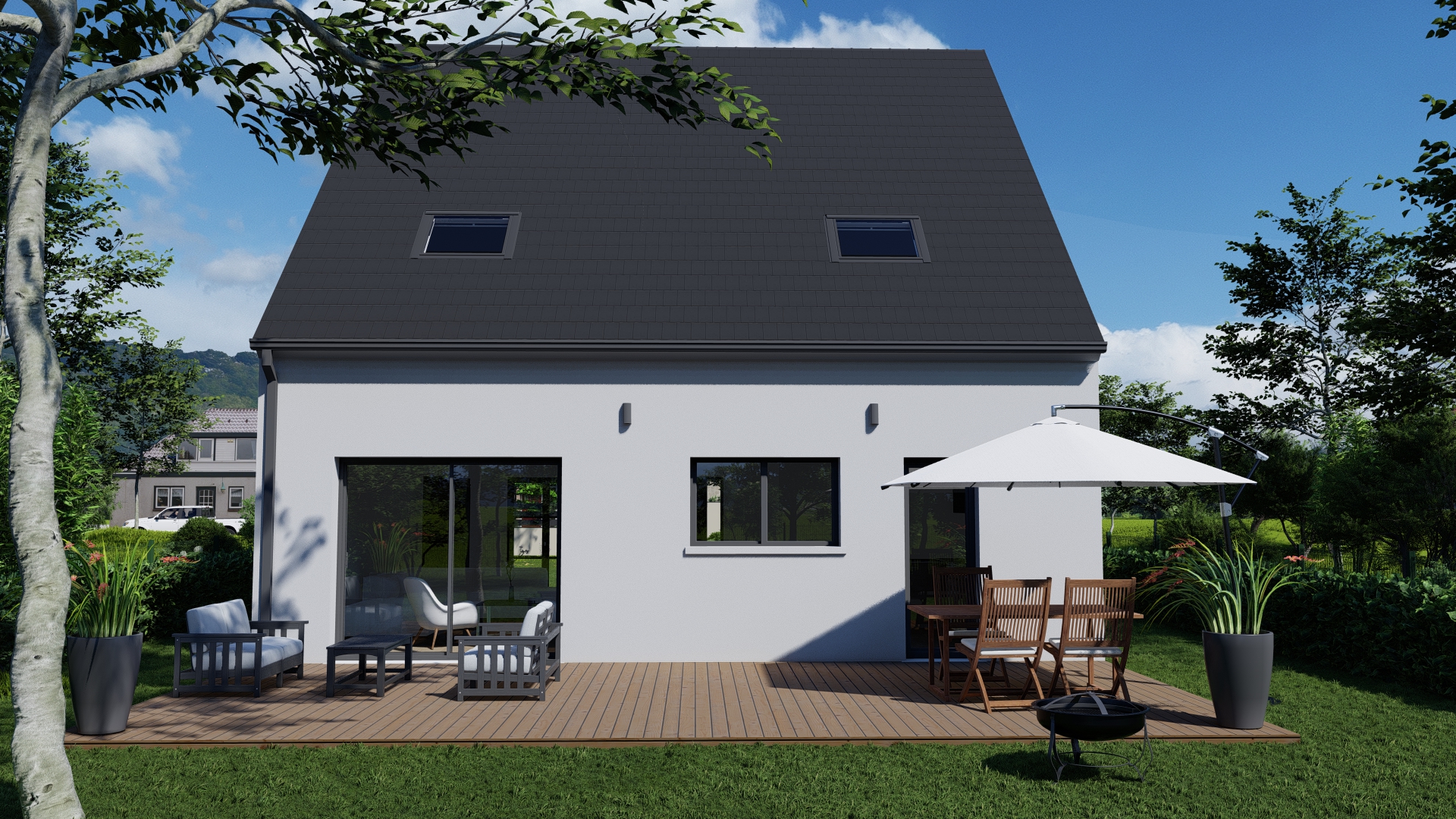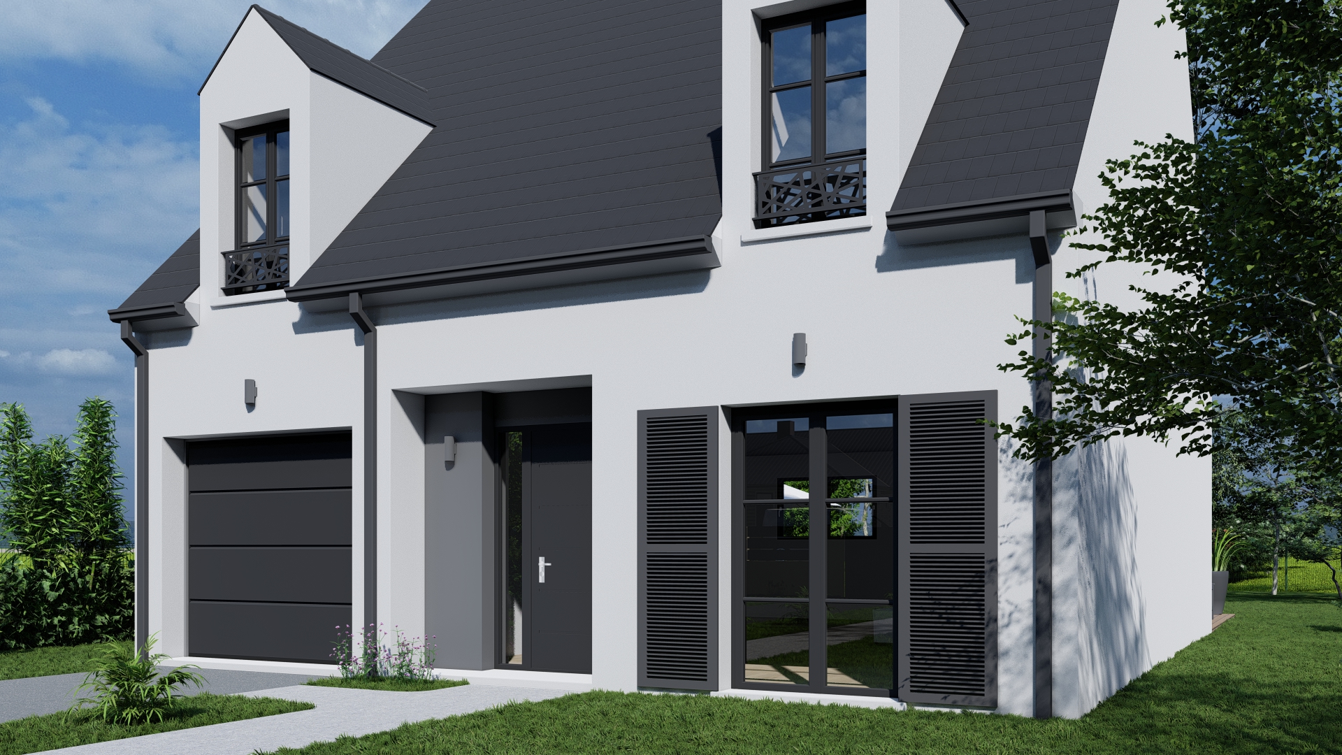 Le modèle AURORE se distingue par une silhouette élancée dominée par une toiture à deux pans affirmée et ponctuée de lucarnes en façade. Cette composition crée un rythme architectural harmonieux, souligné par des proportions équilibrées et des lignes nettes.