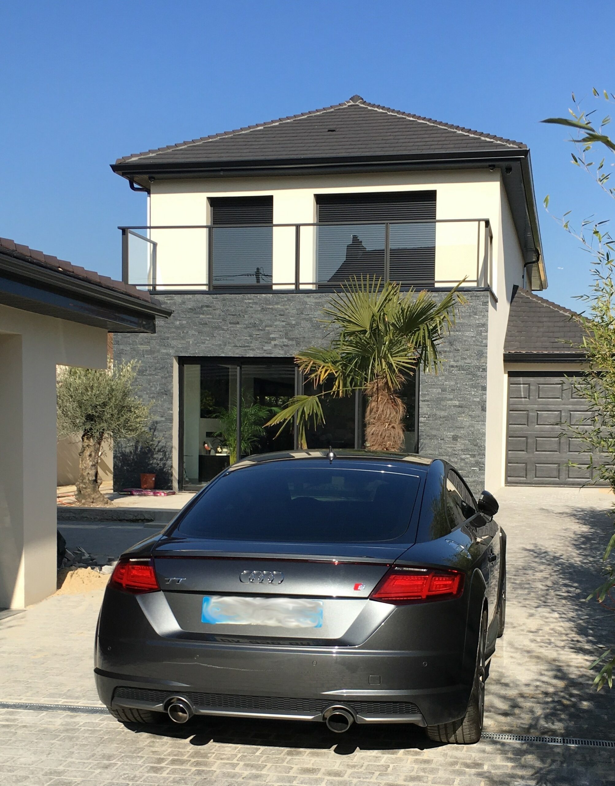 Cette maison se distingue par une architecture contemporaine affirmée, caractérisée par des formes simples et une composition harmonieuse des façades. Le contraste des matériaux et des teintes apporte du relief et du caractère à l’ensemble, pour un rendu à la fois moderne et intemporel.